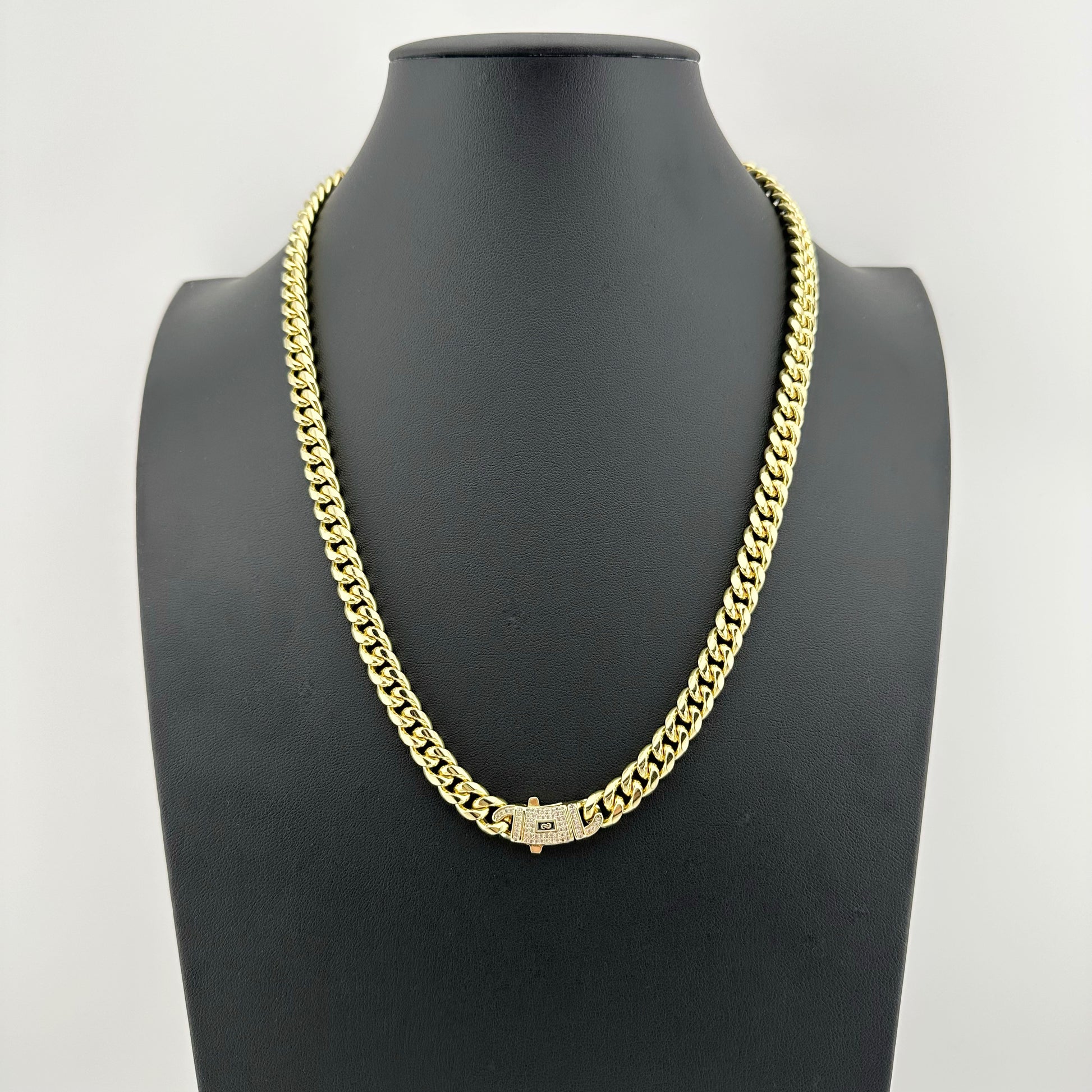 Fabricada en acero inoxidable de alta resistencia y chapado en oro 14K, ofrece un brillo premium que se mantiene con el tiempo.