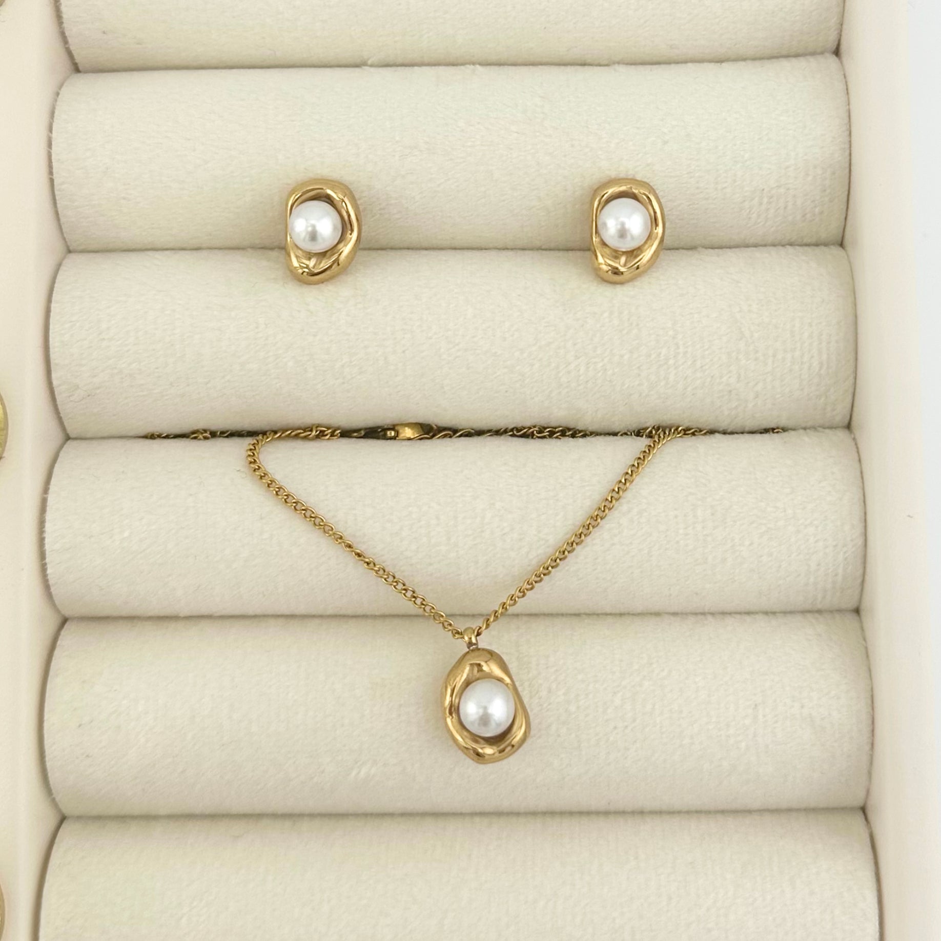Este conjunto de collar y pendientes con perla blanca es ideal para mujeres que aman los accesorios delicados con acabado de lujo. Perfecto para eventos, celebraciones, regalos especiales o para elevar tu look diario con un detalle sofisticado.