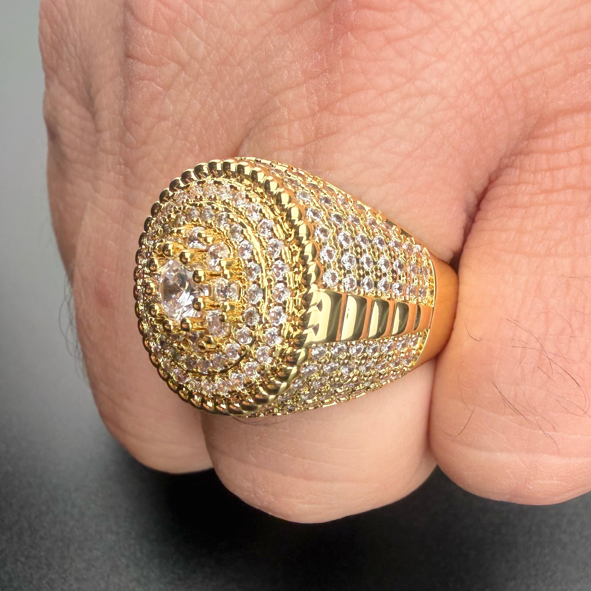 Anillo Hip Hop Redondo Chapado En Oro 14K Con Zirconias – Hombre