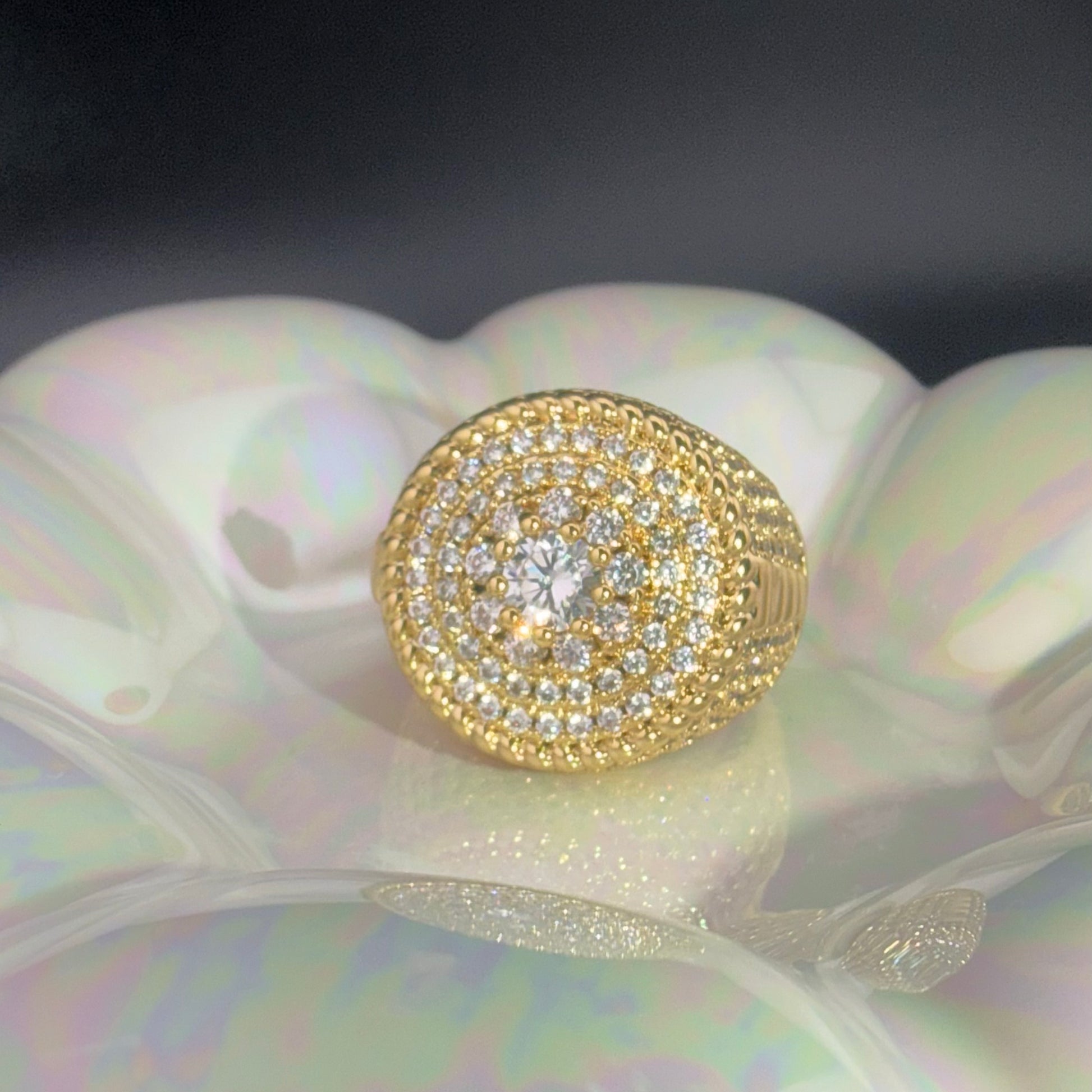 Fabricado en metal con chapado en oro de 14 quilates, ofrece una apariencia lujosa y elegante, ideal para quienes buscan joyas visualmente potentes sin perder comodidad. Su estructura sólida y su diseño redondo lo convierten en un anillo protagonista, perfecto para uso diario o ocasiones especiales.