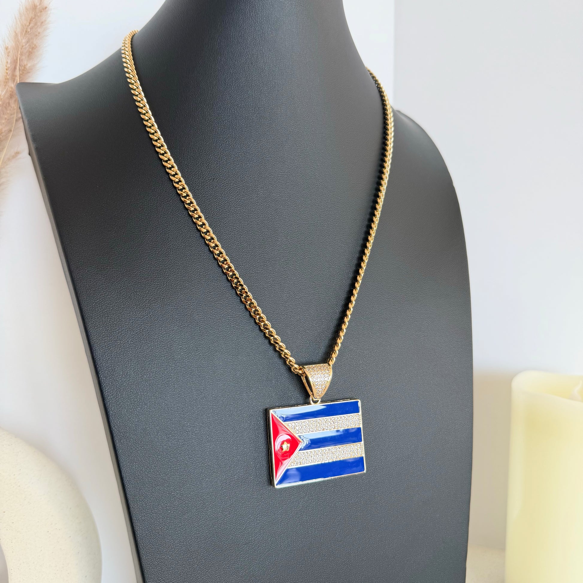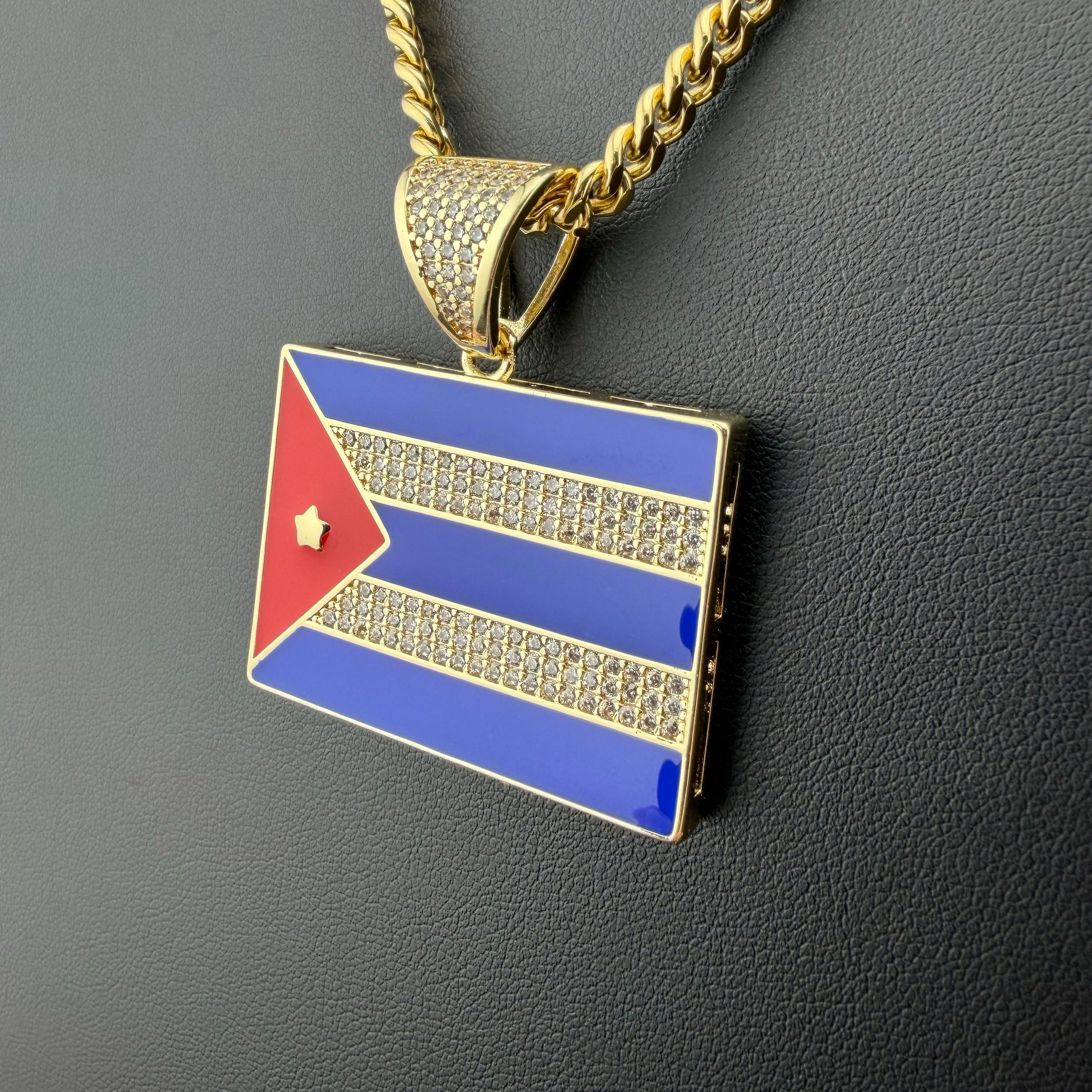 Cadena con dije de bandera de Cuba con zirconias, una pieza con carácter y significado, pensada para quienes buscan expresar identidad y estilo a través de sus accesorios.
