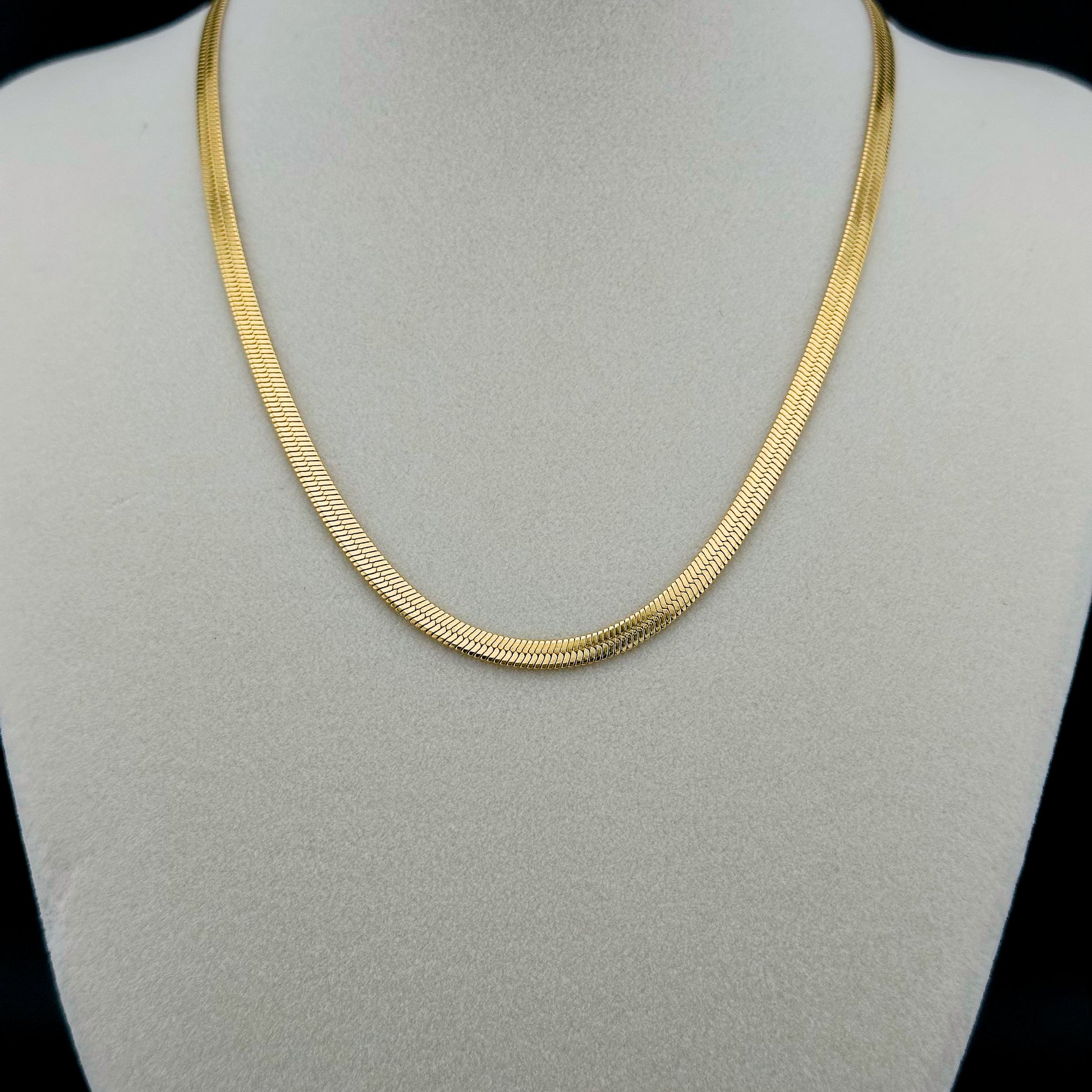 Este collar tipo serpiente destaca por su diseño flexible y acabado liso que aporta un brillo elegante y uniforme. Ideal para llevar solo o combinar con otras piezas para un look más sofisticado.